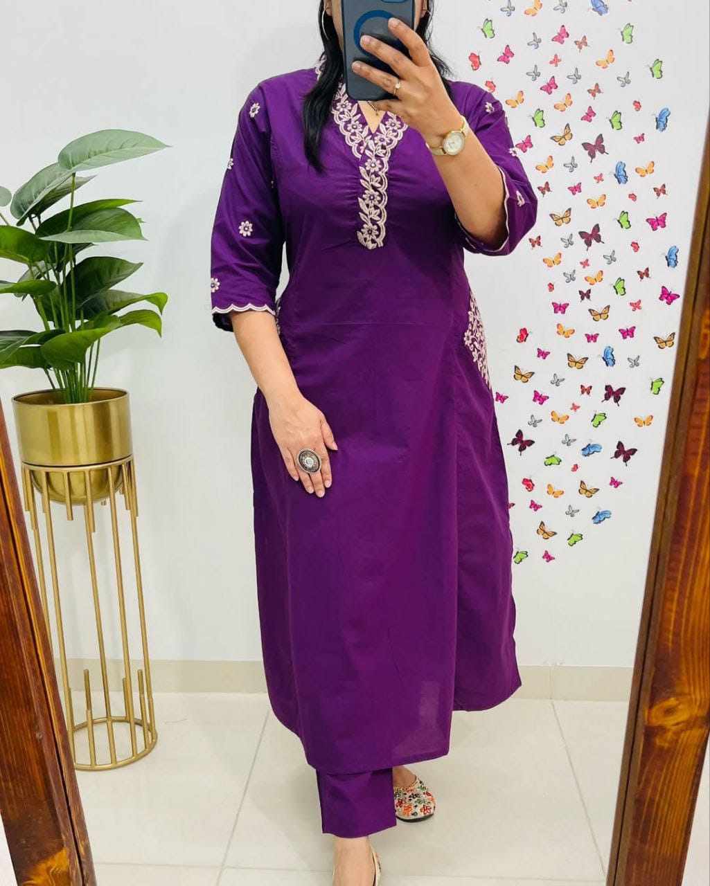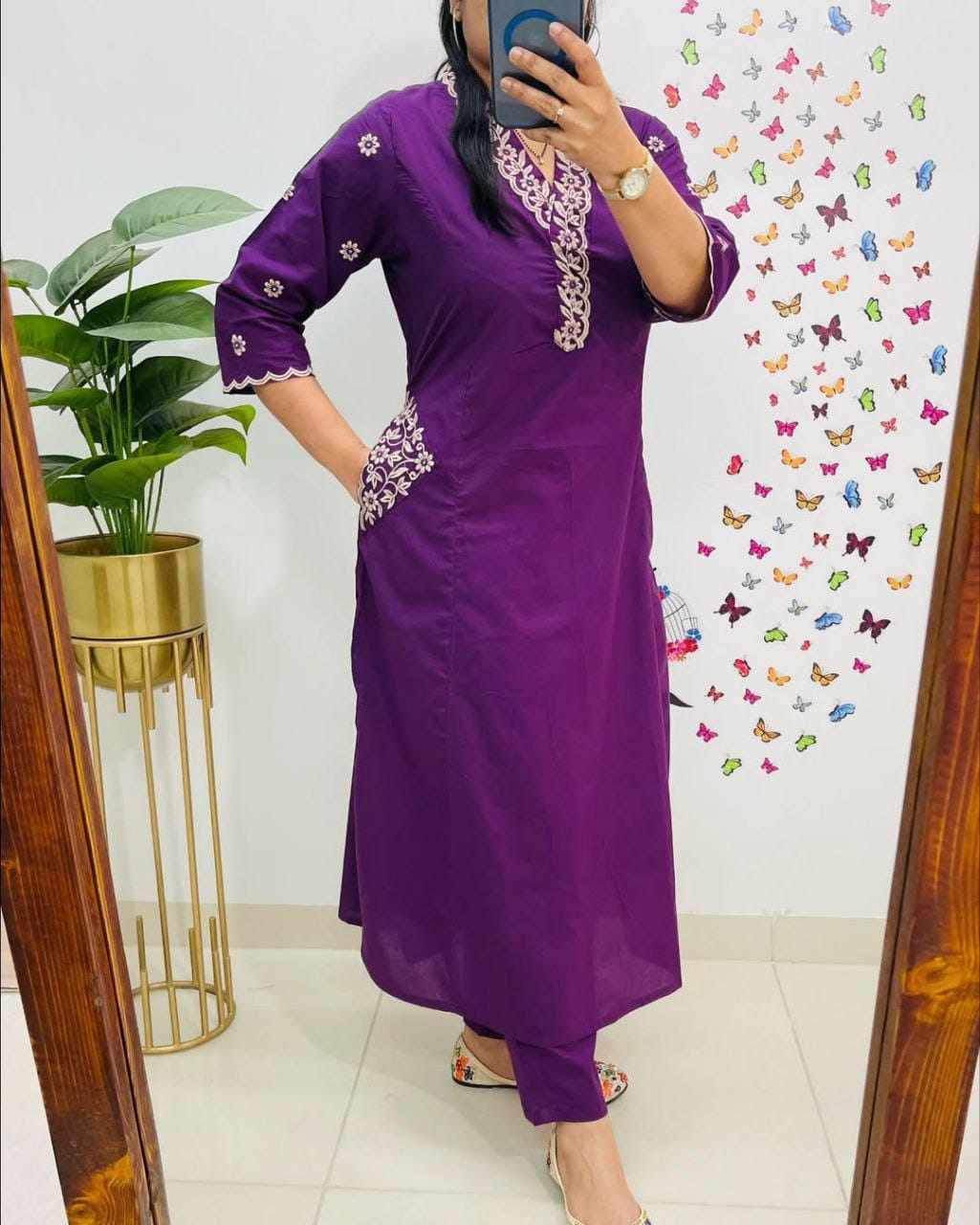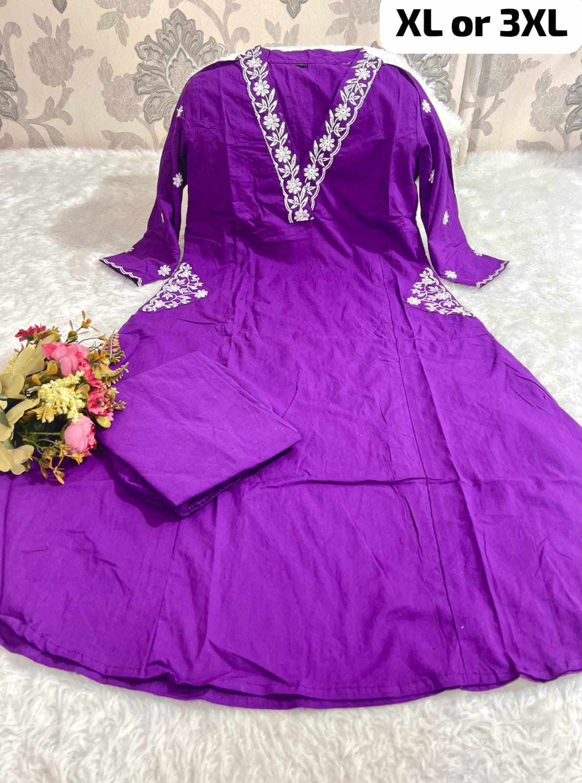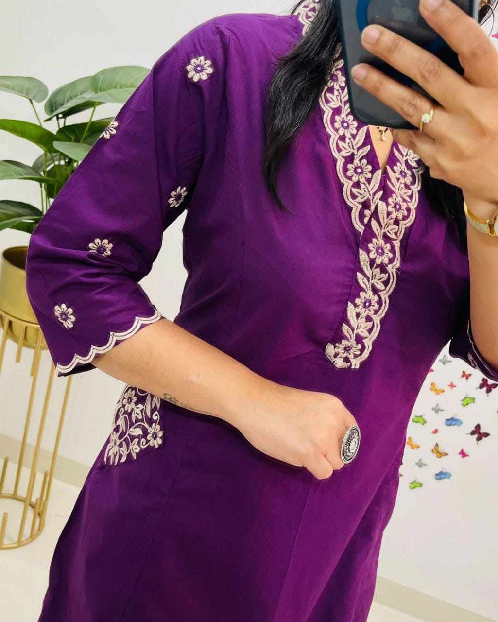 Designer Top Pant set in *Fine Cotton With Heavy thread Embroidery work on the yoke & Both side Pockets*