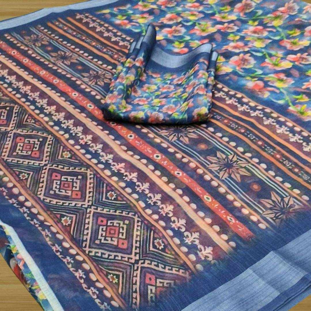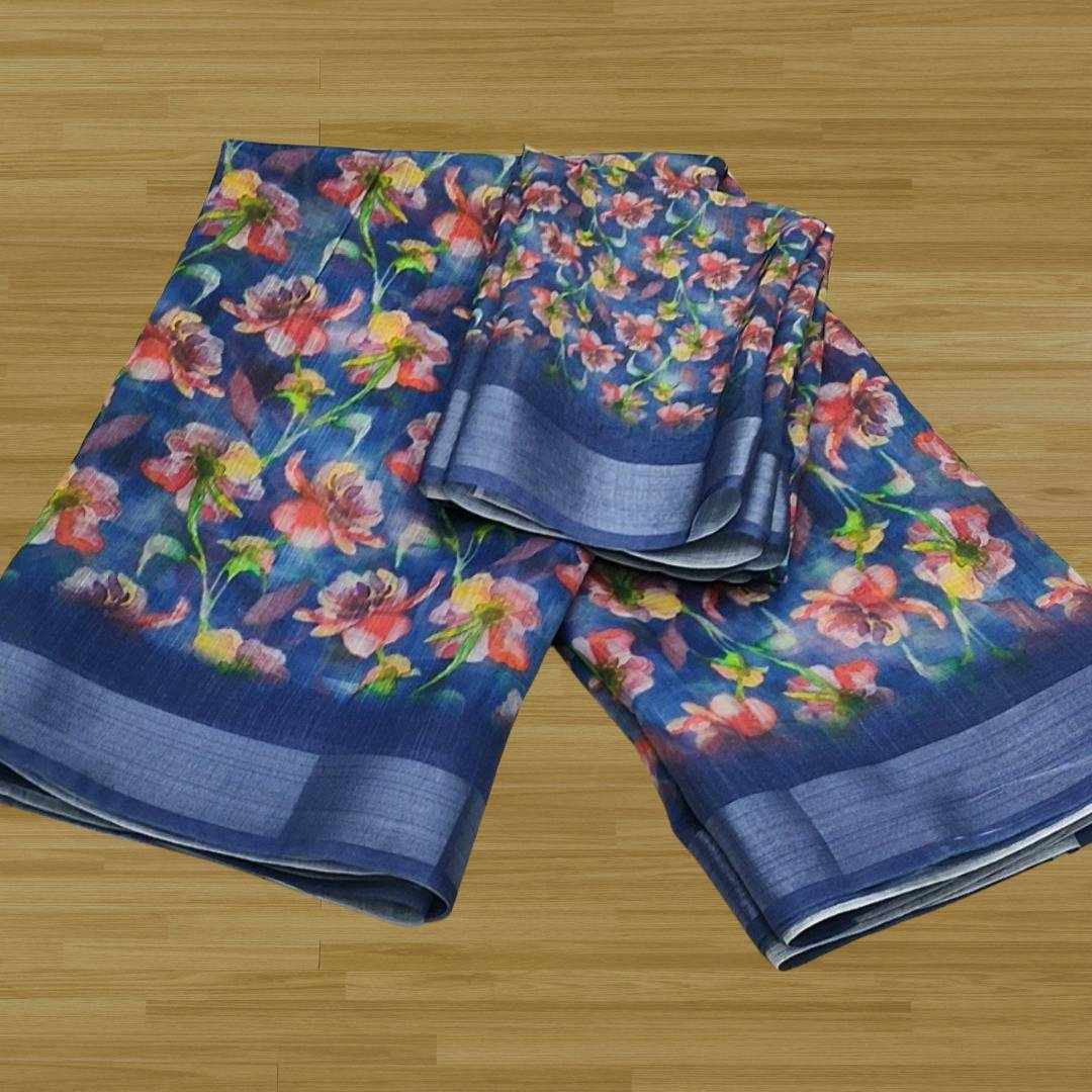 S4S Linen Navy Blue Flower Digital Print Cotton Saree